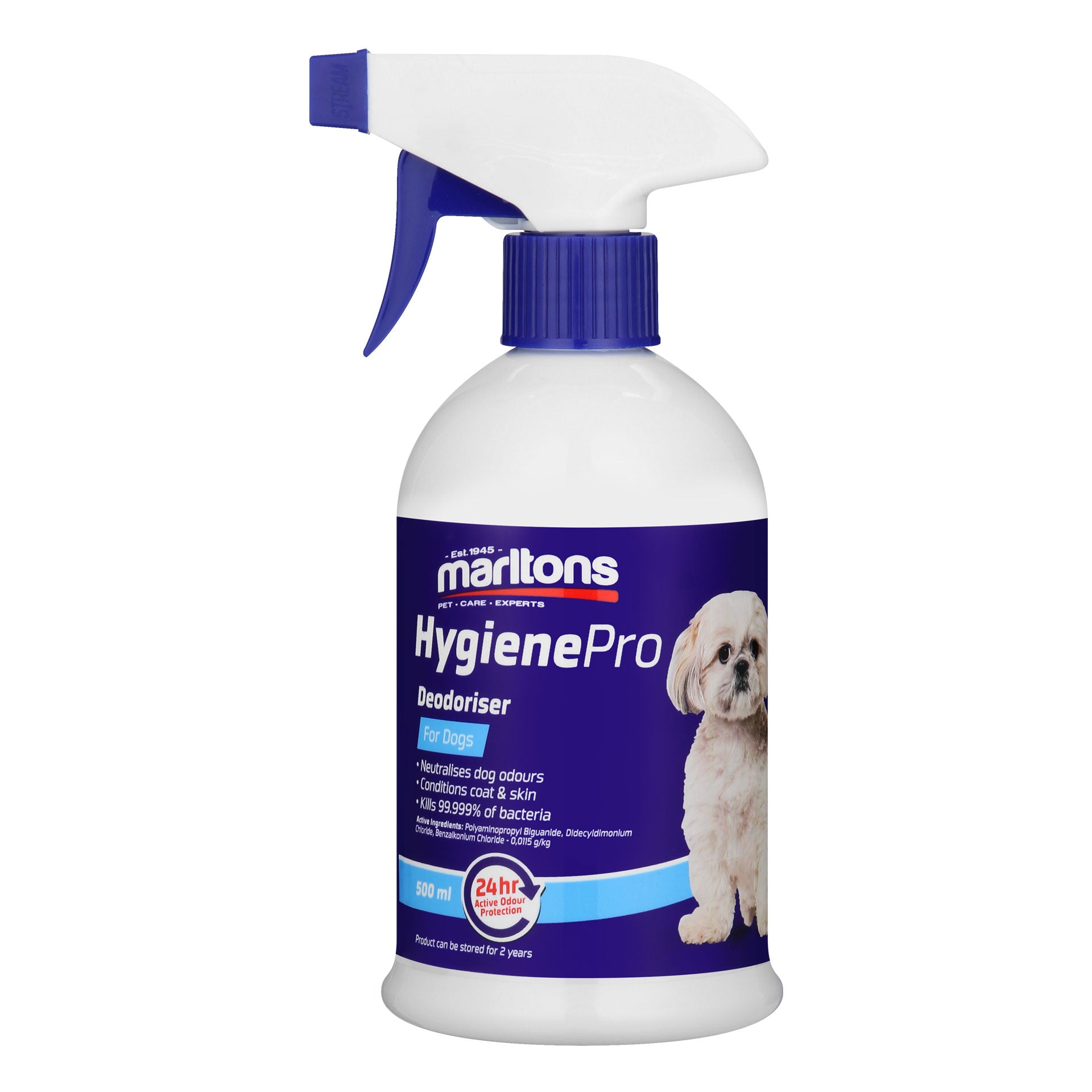 All dogs smell sometimes and typically the cause is bacteria in their coat. HygienePro Deodoriser for dogs effectively kills odour-creating bacteria. It kills 99.999% of germs, unpleasant odours are removed, not masked. It's gentle, long-lasting barrier and cleaning action helps to keep your pet and home hygienic and smelling fresh.